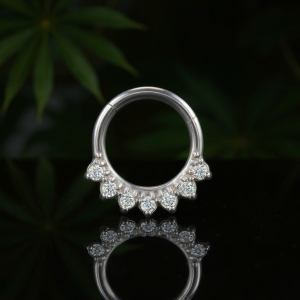 Model ten najlepiej prezentuje się w piercingu septum oraz daith, gdzie cyrkonie są doskonale wyeksponowane i nadają całości elegancki, a jednocześnie wyrazisty charakter.