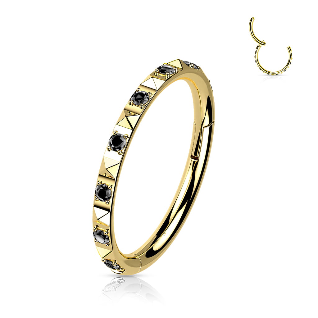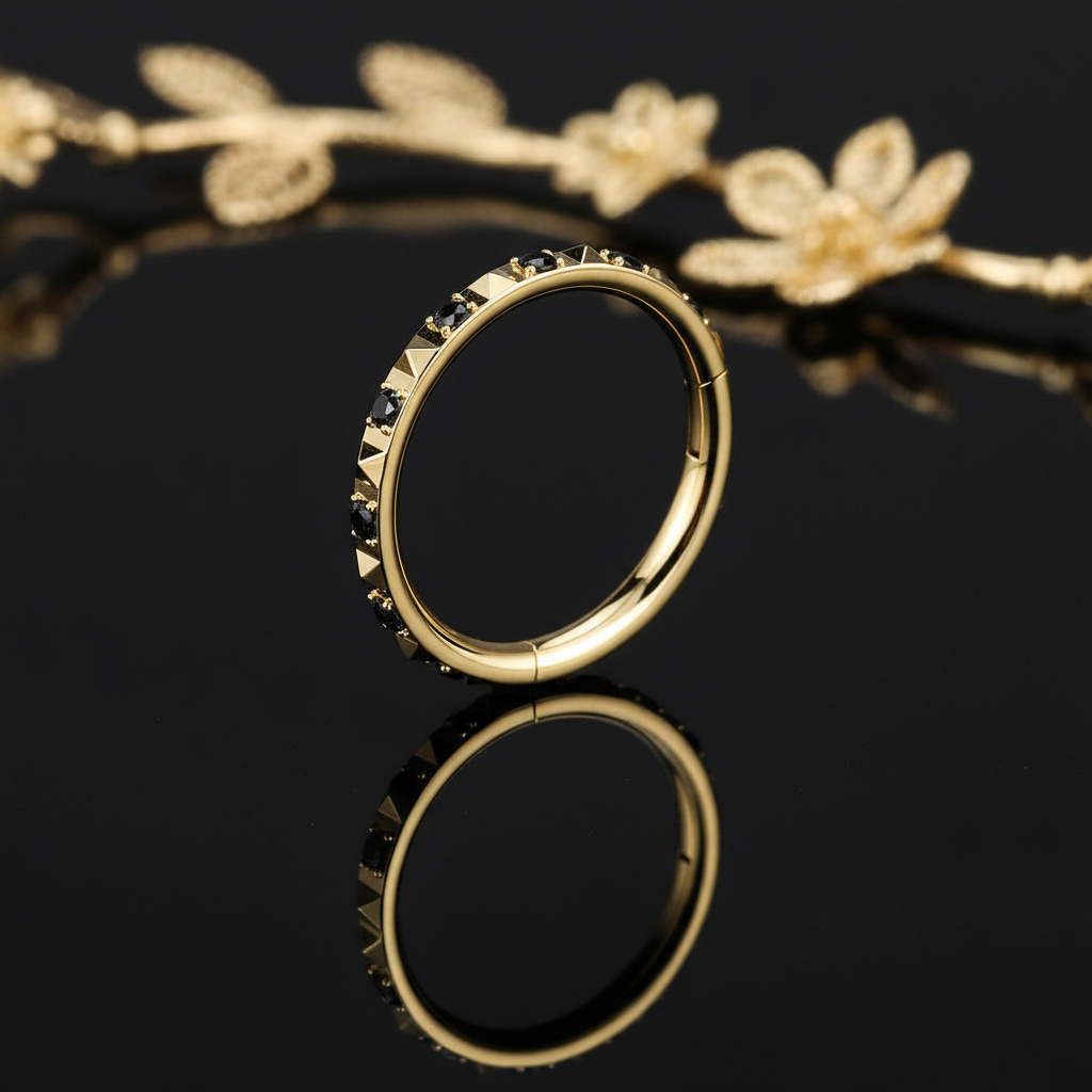 Eleganckie kółeczko clicker z czarnymi cyrkoniami to doskonała propozycja dla osób szukających subtelnego, ale efektownego akcentu w biżuterii do piercingu. Idealnie pasuje do przekłuć typu conch, helix czy lobe, dodając stylu i wyrafinowania.