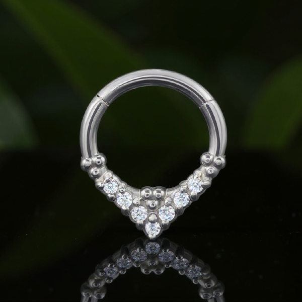 Ten model najlepiej prezentuje się w piercingu typu septum oraz daith, gdzie trójkątny kształt pięknie podkreśla linię przekłucia i przyciąga wzrok delikatnym blaskiem kamieni.