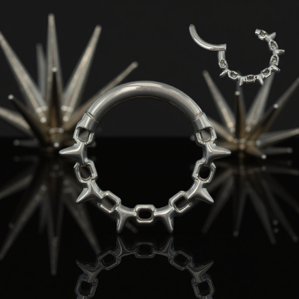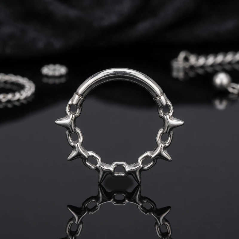 Model świetnie prezentuje się w piercingu septum oraz daith, gdzie jego forma jest doskonale widoczna i podkreśla styl całej stylizacji.
