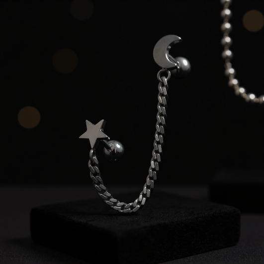 Czarny kolczyk do ucha z łańcuszkiem, księżycem i gwiazdką – magiczny akcent na uchu