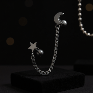 Czarny kolczyk do ucha z łańcuszkiem to idealny wybór dla osób, które pragną wprowadzić subtelną magiczność do swojego piercingu. Zawieszka w postaci księżyca i gwiazdki dodaje całemu zestawowi efektownego uroku, który doskonale łączy dwa przekłucia w lobe i low helix lub dwa upper lobe'y.