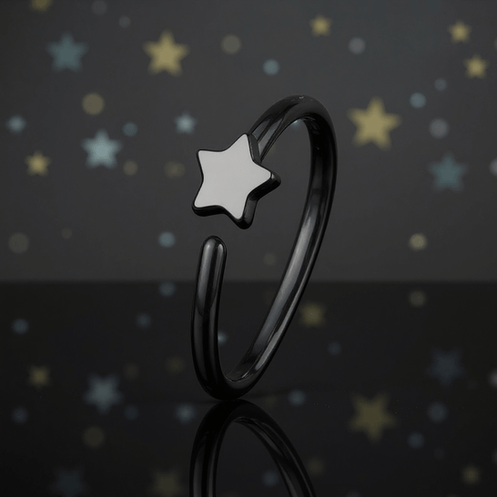 Eleganckie, subtelne i nowoczesne – czarne kółeczko do nosa z gwiazdką to idealna propozycja dla osób, które szukają biżuterii łączącej klasykę z odrobiną wyrazistości. Kółeczko wykonane ze stali chirurgicznej 316L z powłoką IP ma wyjątkowy, ciemny kolor, który nadaje mu elegancji i tajemniczości. Ozdoba w postaci małej gwiazdki dodaje całości niepowtarzalnego charakteru.