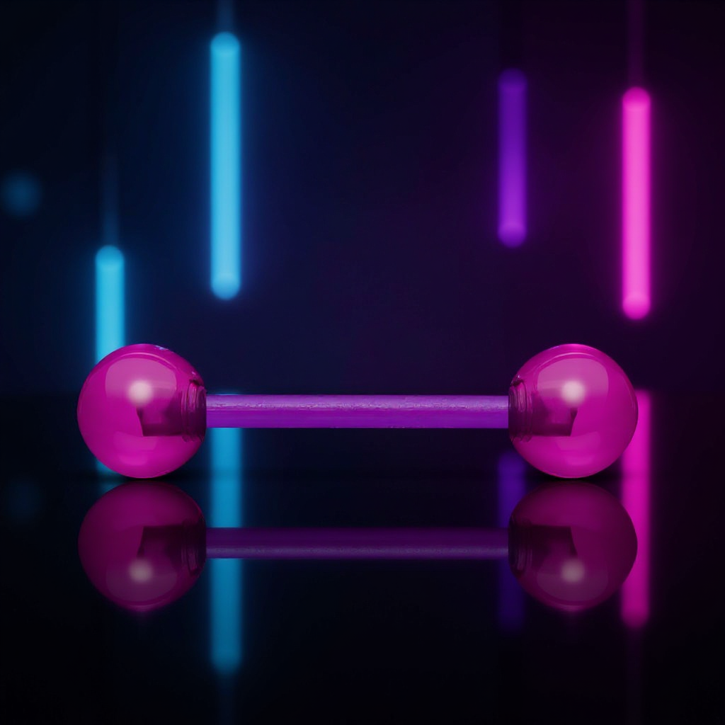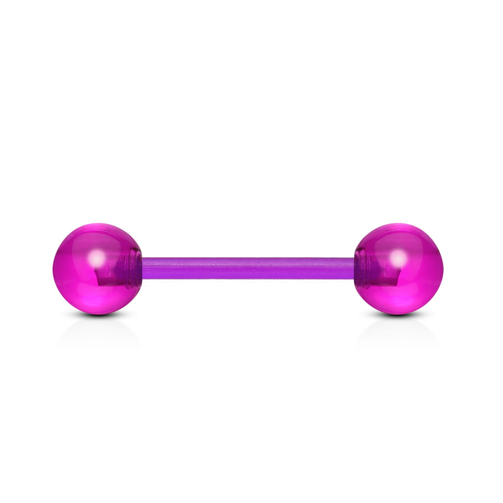 Stylowy kolczyk do języka wykonany ze sztangi z bioflexu, z akrylowymi kulkami w fioletowym odcieniu, który łączy wygodę z efektownym wyglądem.