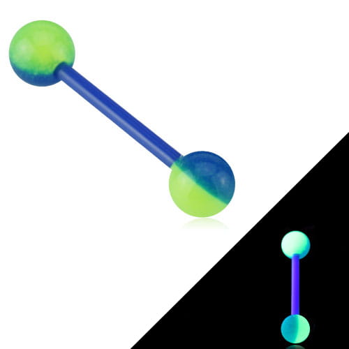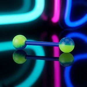Wyjątkowy kolczyk do języka wykonany ze sztangi z bioflexu, z kulkami z akrylu w zielono-niebieskim odcieniu, które świecą w ciemności, tworząc efektowny, przyciągający wzrok detal.