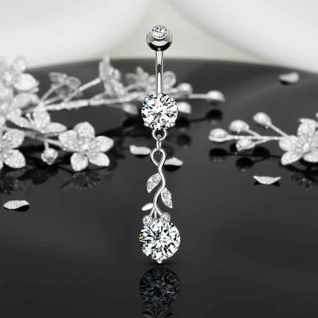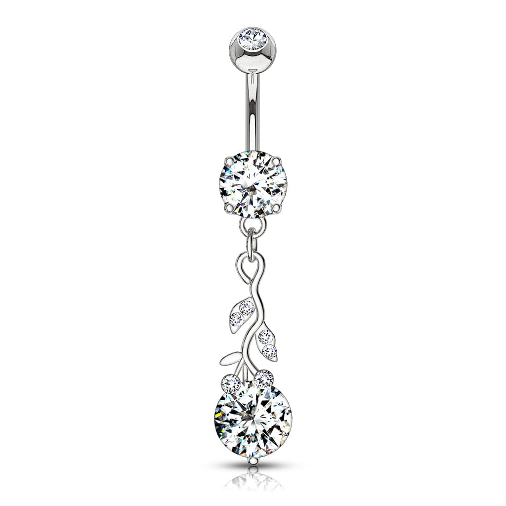 Ten delikatny kolczyk do pępka zachwyca zawieszką w kształcie gałązki ozdobionej białymi cyrkoniami, tworząc elegancką, kobiecą kompozycję inspirowaną naturą.