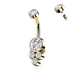 Niezwykle ozdobny złoty kolczyk do pępka z clusterem utworzonym przez 4 kamienie typu Cubic zirconia (CZ).