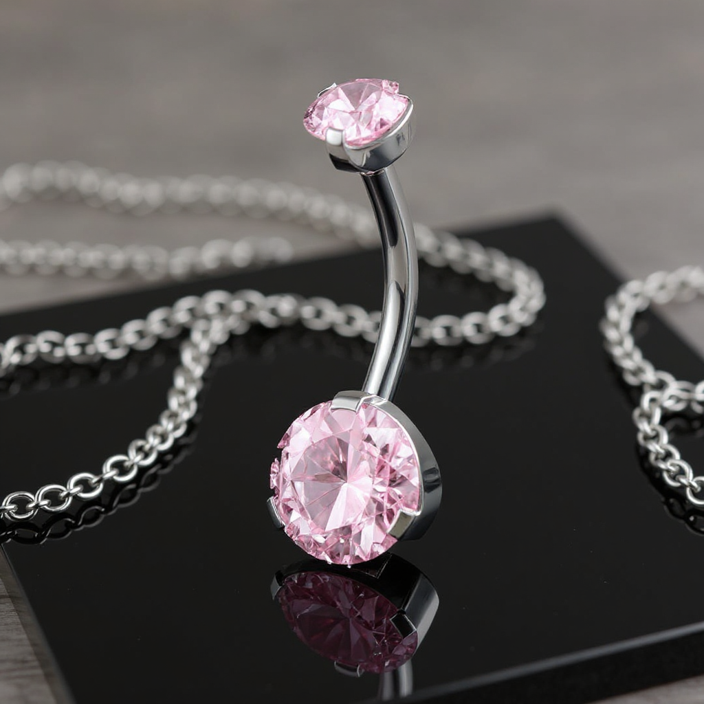 Delikatny i elegancki kolczyk do pępka ozdobiony dwoma dużymi, pudroworóżowymi cyrkoniami kubicznymi, które pięknie odbijają światło, tworząc subtelny, migotliwy blask o romantycznym charakterze. Górna kulka posiada bezpieczny gwint wewnętrzny, zapewniający stabilność i komfort noszenia.