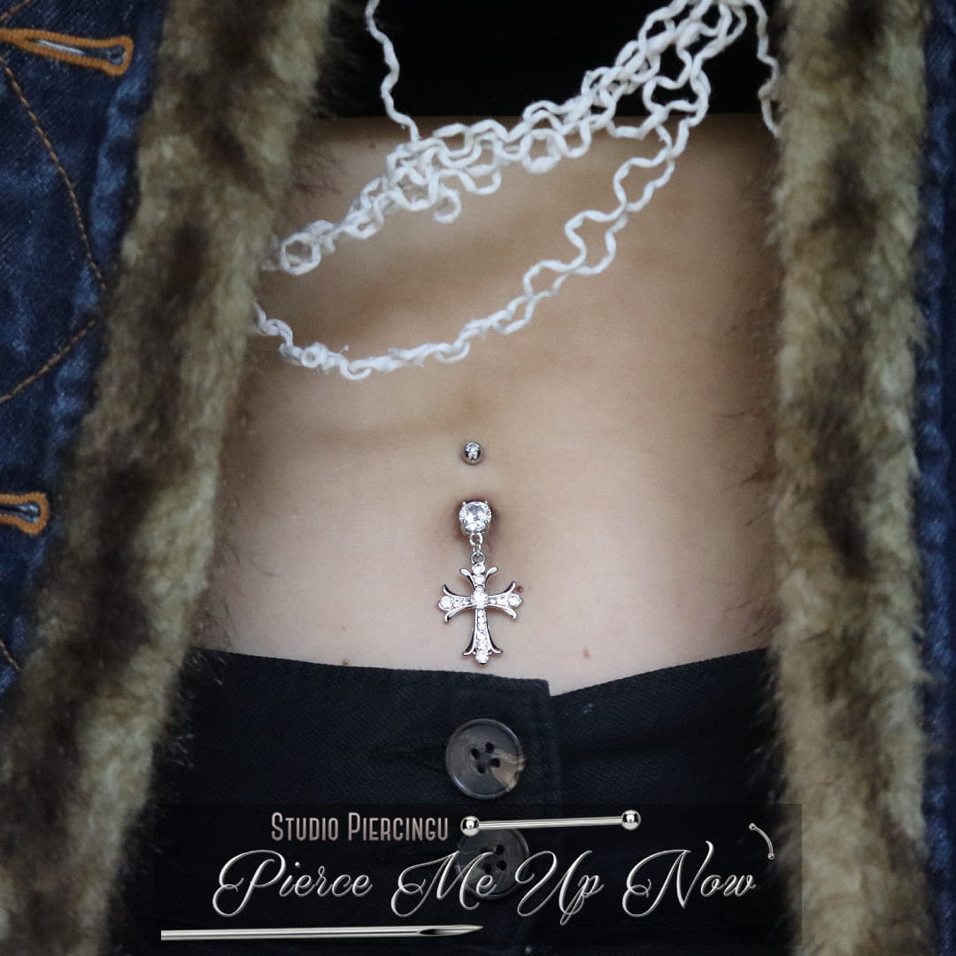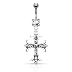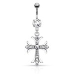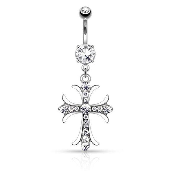 Kolczyk do pępka z celtyckim krzyżem wysadzany białymi kryształkami o różnej wielkości.