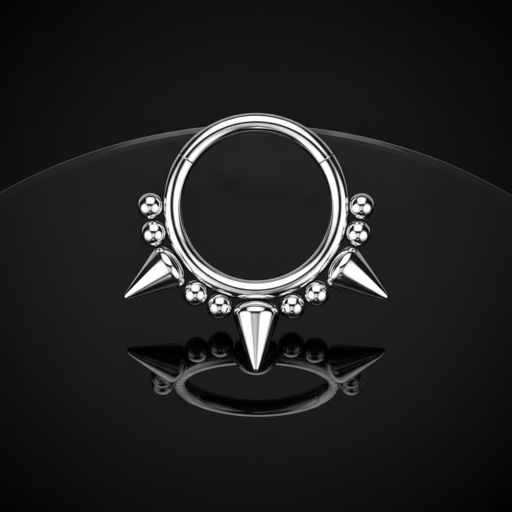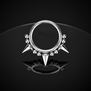To charakterystyczne kółeczko do septum/daitha z trzema wyrazistymi grotami, które dodają odważnego i nowoczesnego wyglądu Twojej biżuterii ciała. Idealne dla osób, które szukają oryginalności i mocnego akcentu w swojej kolekcji kolczyków.
