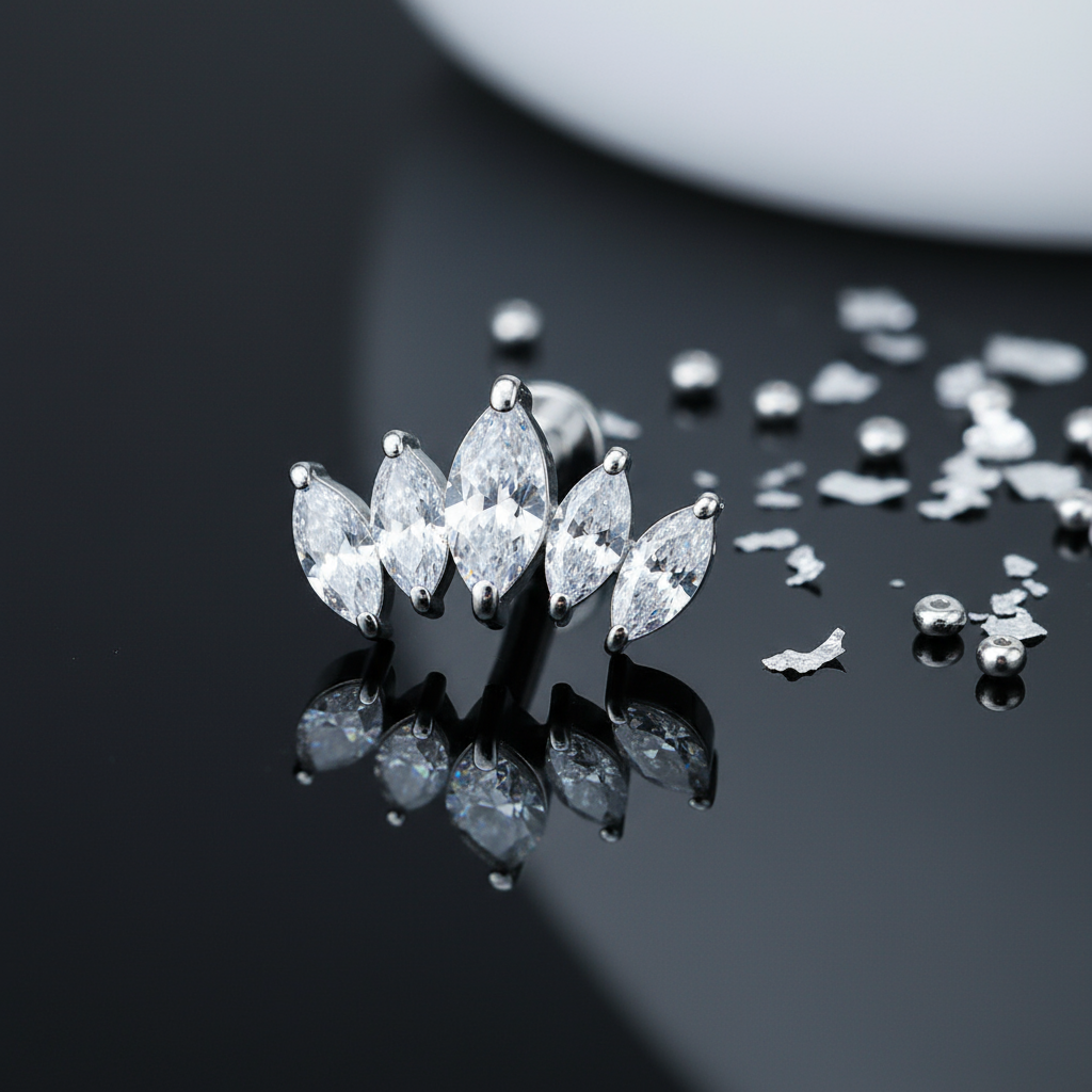 Ozdobny labret typu cluster zachwyca pięcioma cyrkoniami o eleganckim kształcie markizy, które tworzą efektowną, błyszczącą kompozycję. Dzięki swojemu designowi pięknie prezentuje się w przekłuciach helix, conch oraz flat helix, dodając im subtelnego blasku i wyjątkowego charakteru.