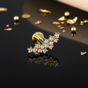 Misternie zdobiony złoty labret o kształcie delikatnego łuku, wypełniony drobnymi, błyszczącymi białymi cyrkoniami, które układają się niczym subtelna konstelacja. Ich jasny blask pięknie kontrastuje ze złotym wykończeniem, tworząc elegancką i harmonijną kompozycję. Biżuteria doskonale prezentuje się w przekłuciach helix, conch oraz flat helix, dodając im szykownego, kobiecego charakteru.
