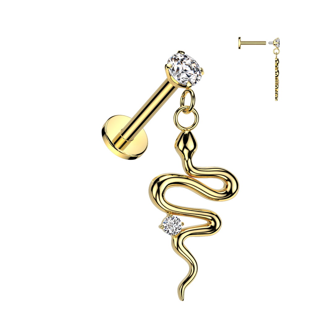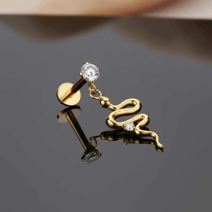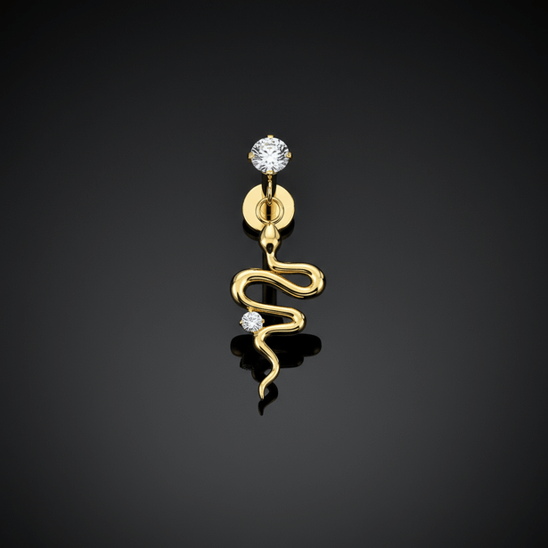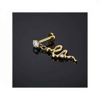 Ten wyjątkowy labret łączy elegancję z odrobiną tajemniczości. Ozdobiony 3 mm białą cyrkonią i zawieszką w kształcie kryształowego węża, który zwinnie oplata Twoje ucho. Zawieszka o długości 15,4 mm nadaje całości unikalny charakter.