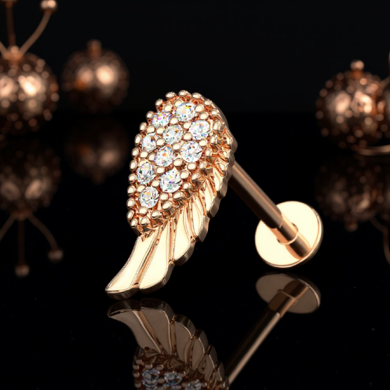 Labret z przepięknie zdobionym skrzydłem anioła z białymi kryształkami. Całość zaprojektowana z niezwykłą dbałością o detale.