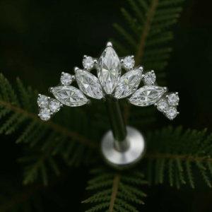 Ozdobny labret z tytanu zdobiony aż 15 błyszczącymi cyrkoniami o różnych kształtach: markizy i okrągłe. Kompozycja przypomina diadem, dając efekt luksusu i blasku. Takiej tiary nie powstydziłaby się żadna księżniczka!