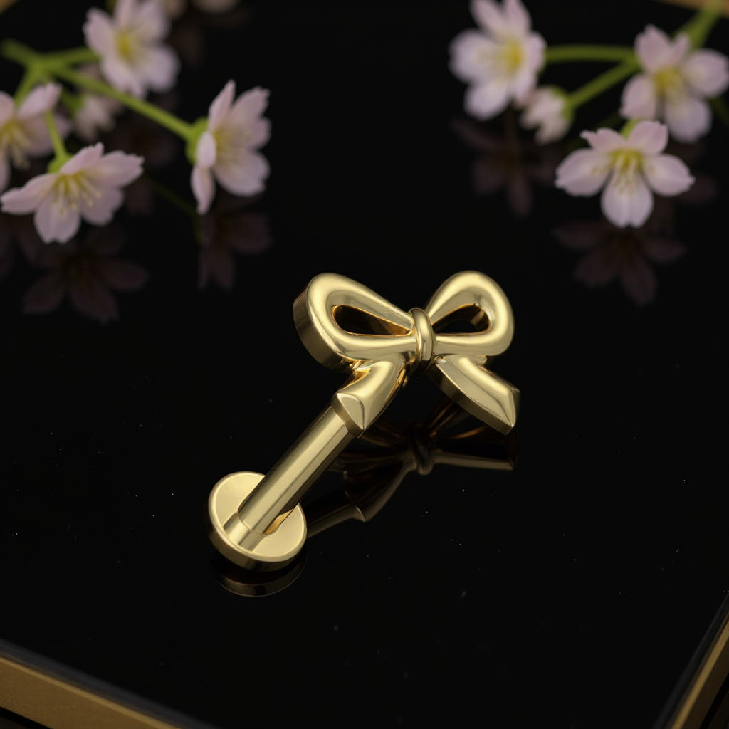 Delikatny labret z motywem kokardki to idealna propozycja dla osób, które lubią subtelne, kobiece akcenty w biżuterii do piercingu.