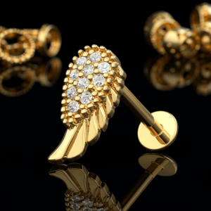 Labret z przepięknie zdobionym skrzydłem anioła z białymi kryształkami. Całość zaprojektowana z niezwykłą dbałością o detale.