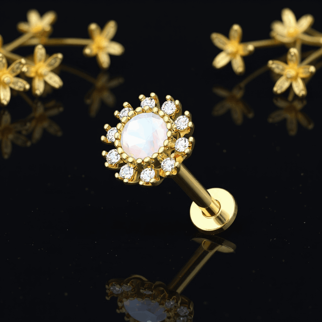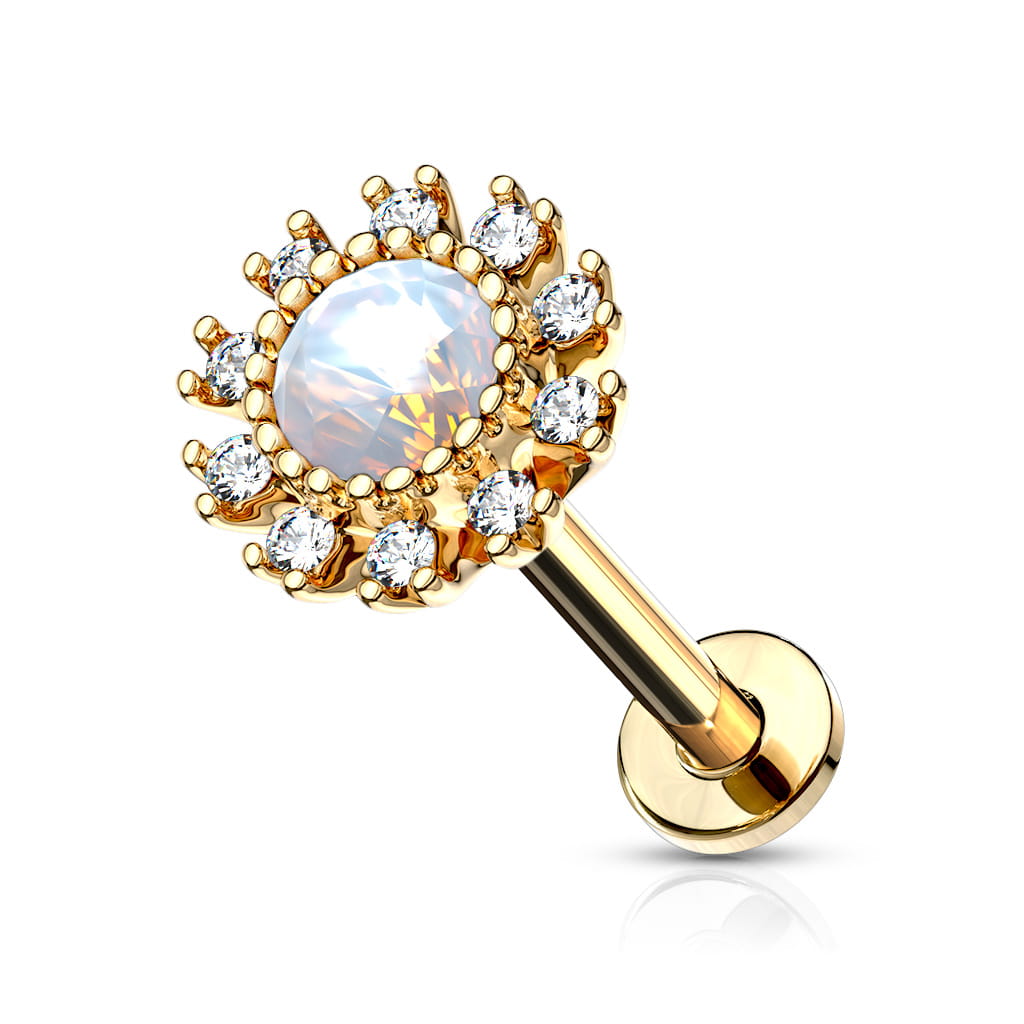 Labret z przepięknie zdobionym kwiatem obsypany białymi kryształkami, centrum ozdoby stanowi lśniący syntetyczny opalit.