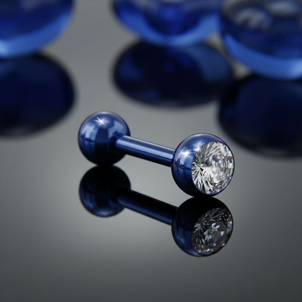 Elegancki kolczyk do języka w formie sztangi w intensywnym, niebieskim kolorze, ozdobiony lśniącą, białą cyrkonią. Dzięki klasycznemu designowi i nowoczesnemu wykończeniu biżuteria świetnie sprawdzi się zarówno na co dzień, jak i na specjalne okazje.