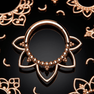 Clicker w kolorze różowego złota w stylu orientalnym z kwiatem lotosu.