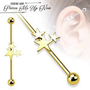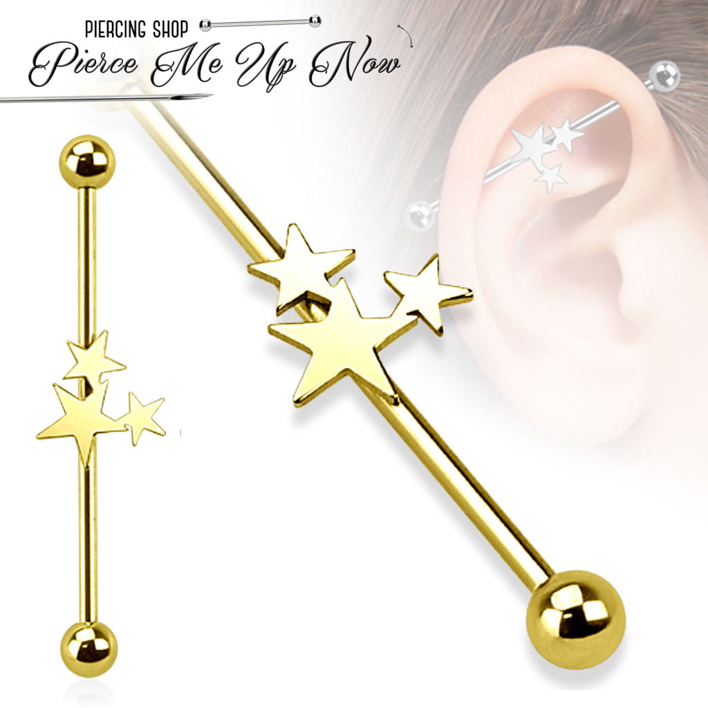 Stylowa złota sztanga do industriala ozdobiona trzema gwiazdkami, które dodają biżuterii wyjątkowego, kosmicznego uroku. Wykonana w całości z wysokiej jakości stali chirurgicznej 316L i pokryta trwałą powłoką PVD w odcieniu klasycznego złota – łączy elegancję z trwałością.