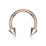 Elegancka i wyrazista podkówka z grotami w kolorze różowego złota to stylowy wybór dla osób szukających wyjątkowej biżuterii do przekłuć takich jak septum, daith, warga czy smiley. Ciepły odcień różowego złota pięknie komponuje się z różnymi stylizacjami, dodając im subtelnego blasku.