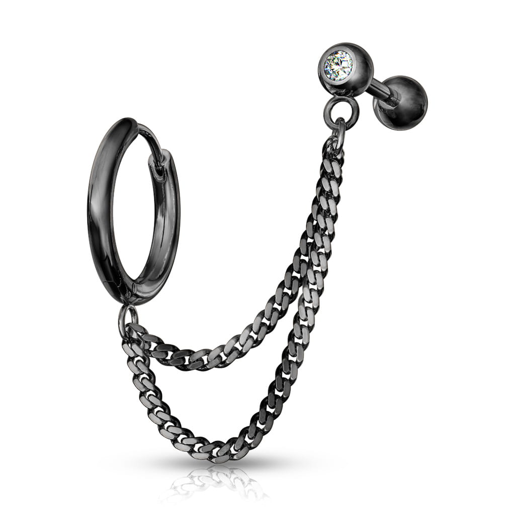 Kolczyk przepięknie łączy dwa przekłucia typu lobe i upper lobe rozciągając łańcuszek pomiędzy przekłuciami.