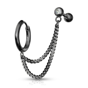 Czarny clicker połączony ze sztangą łańcuszkiem o długości około 20 mm. Sztanga z białym kryształkiem.