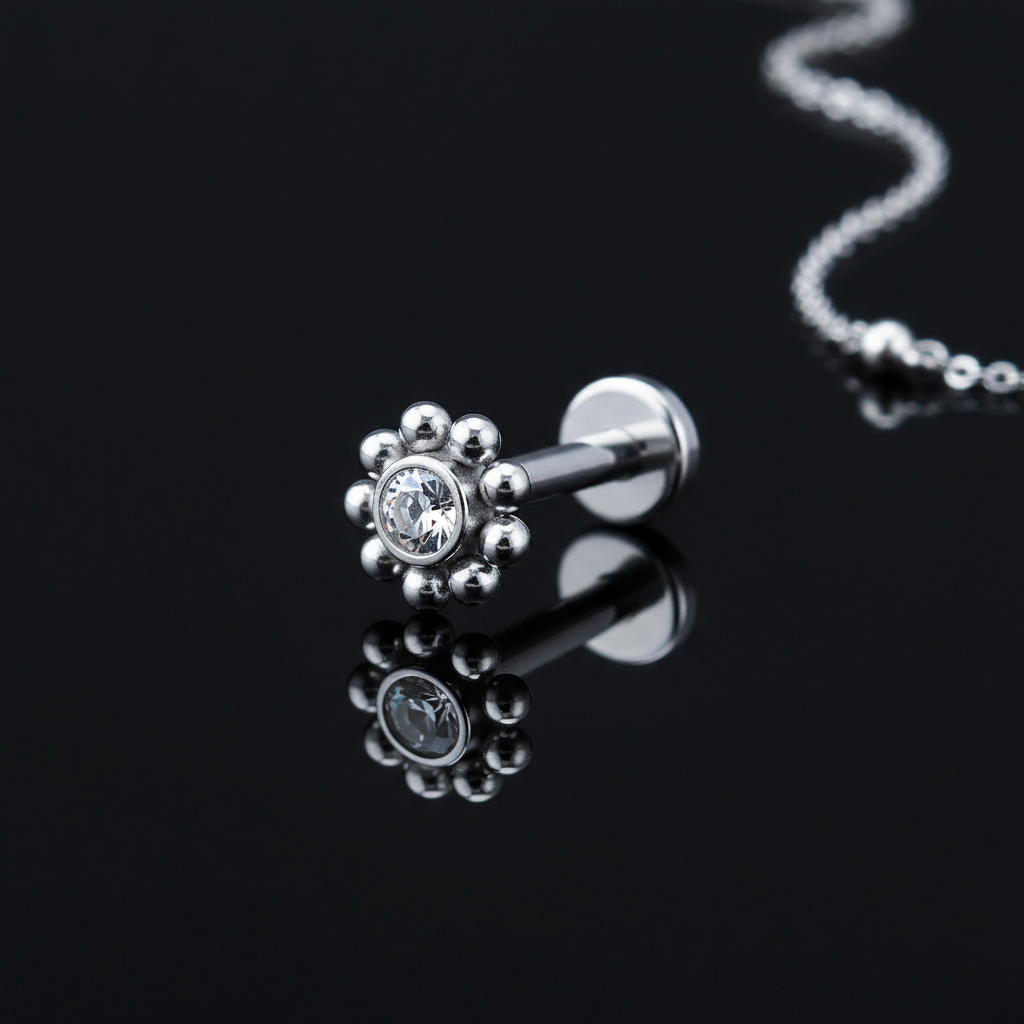 Piękny, minimalistyczny labret z kryształkiem otoczonym malutkimi kuleczkami.