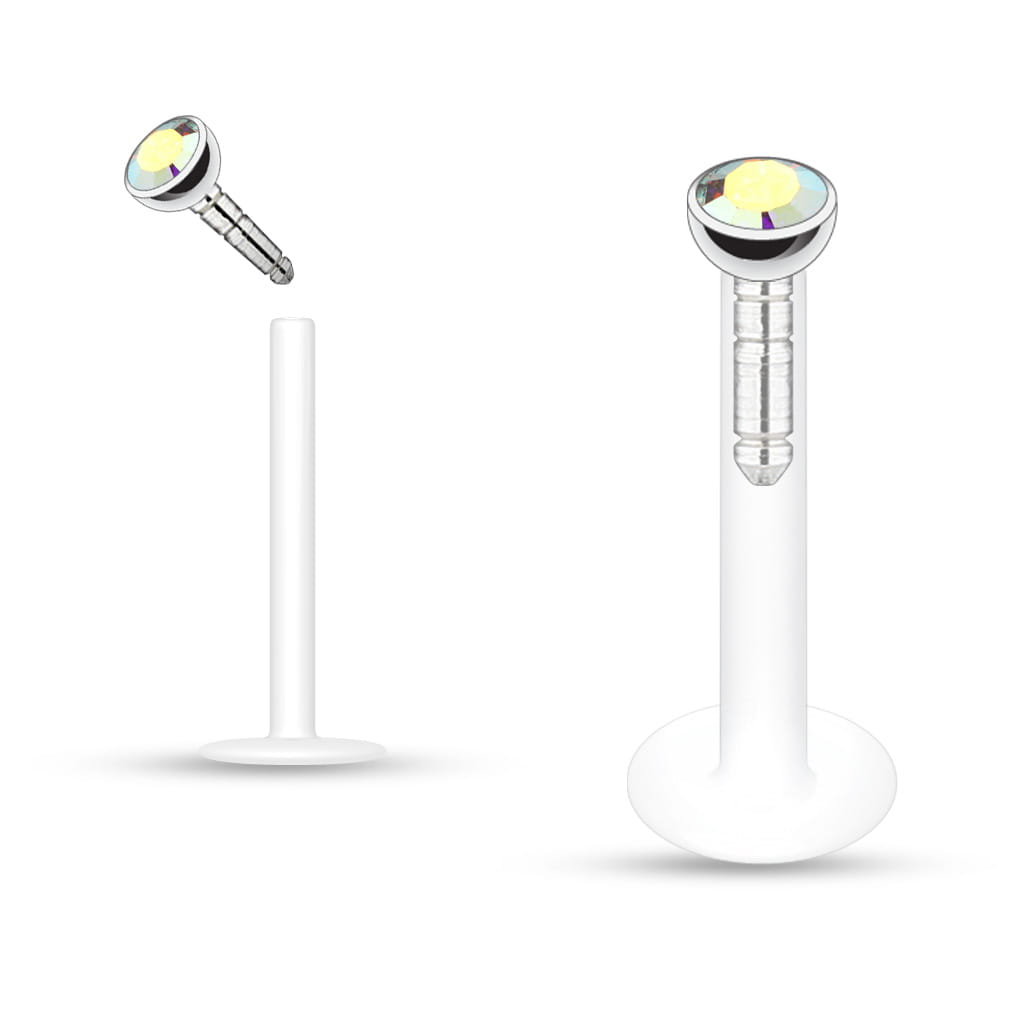 Przezroczysty labret z elastycznego bioflexu z opalizującym kryształkiem.