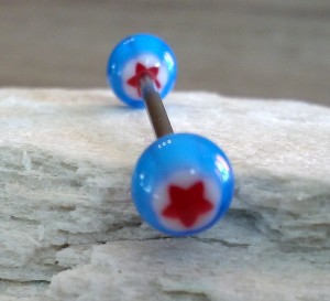 Stalowa sztanga z niebieskimi akrylowymi kulkami z czerwoną gwiazdą.