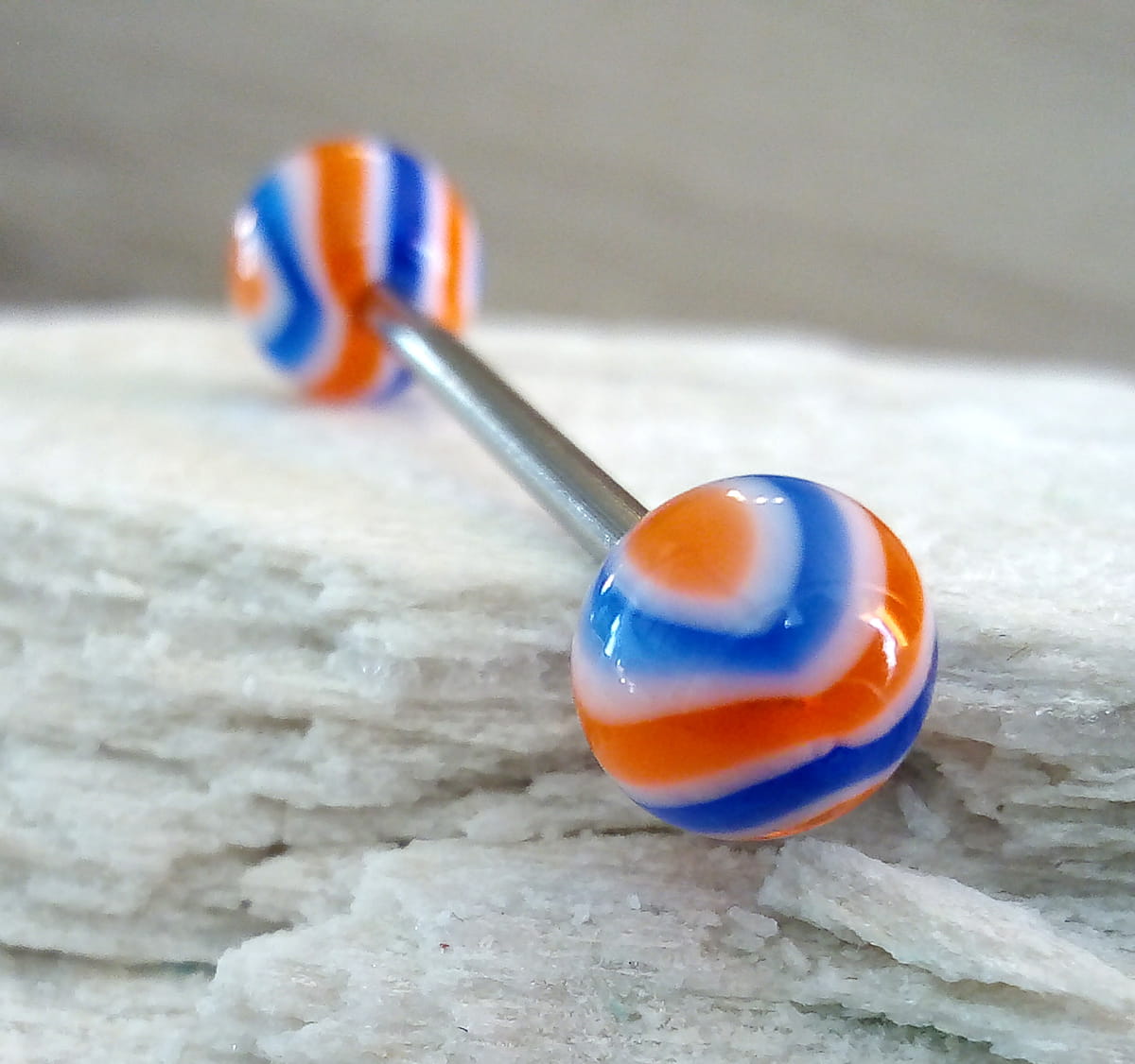 Stalowa sztanga z niebiesko pomarańczowymi akrylowymi kulkami.