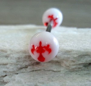 Stalowa sztanga z białymi akrylowymi kulkami z czerwonym tribalem.