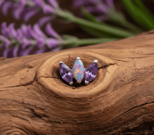Wyjątkowy labret dla osób, które cenią oryginalne formy i wyraziste kolory. Nakrętkę zdobią trzy kamienie w szlifie markiza: centralnie umieszczony syntetyczny opal w intensywnym fiolecie mieni się wielowymiarowym blaskiem, a po jego bokach znajdują się fioletowe cyrkonie kubiczne, tworząc harmonijną i elegancką kompozycję.