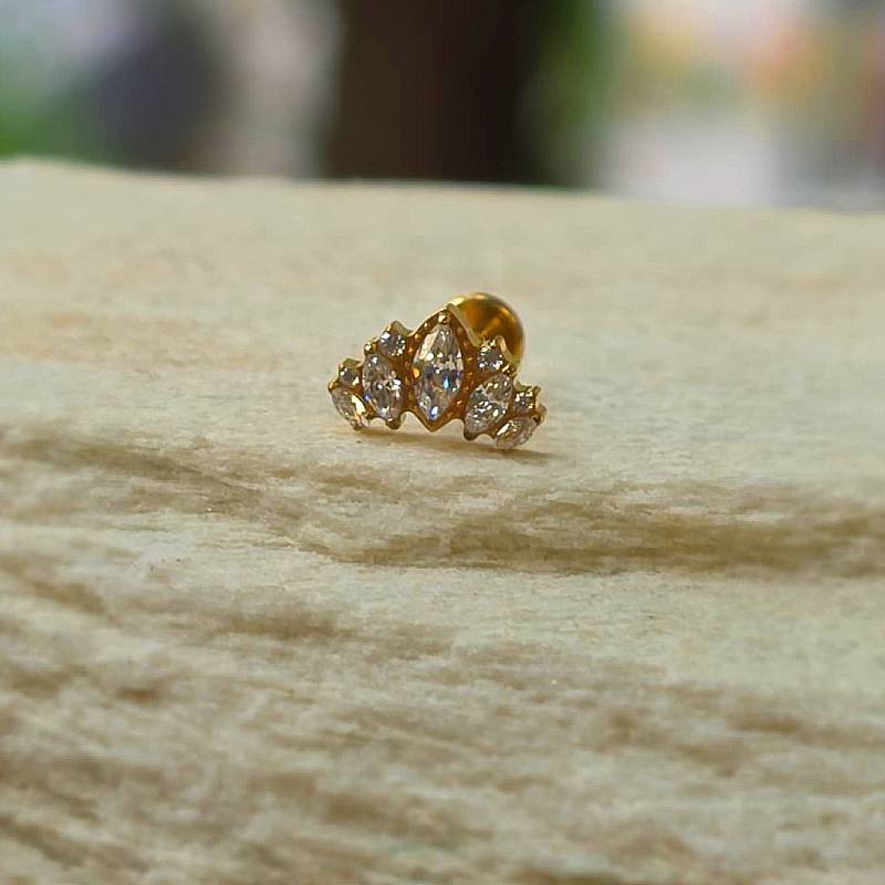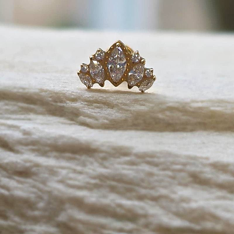 Elegancki labret wykonany z tytanu, ozdobiony aż dziewięcioma cyrkoniami. Centralnym elementem biżuterii jest duża, szlifowana na kształt markizy cyrkonia, otoczona symetrycznie mniejszymi, błyszczącymi cyrkoniami. Kompozycja przypomina kształtem koronę lub kwiatowy motyw, co nadaje labretowi luksusowego i wyrafinowanego wyglądu.