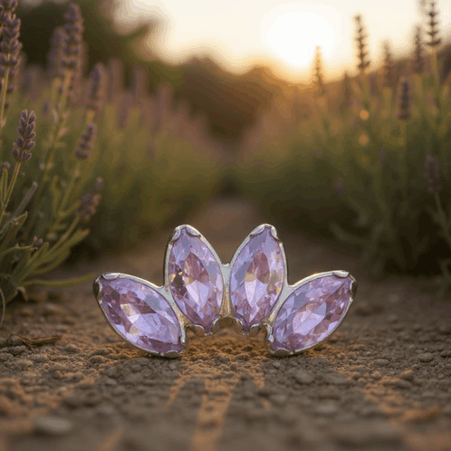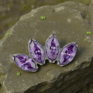Elegancki labret wykonany z tytanu ASTM F-136 - biokompatybilny, hipoalergiczny i odporny na korozję. Nakrętka typu CLUSTER składa się z 4 cyrkonii w szlifie markiza w intensywnym odcieniu ametystu, tworząc diademowy akcent. Kolor nawiązuje do naturalnych tonów: fioletowe wrzosowisko, szlachetność ametystu i wieczorna poświata lasu, co dodaje biżuterii organicznego, luksusowego charakteru. Cyrkonie są mocno osadzone w precyzyjnej koronce z czteropunktowym mocowaniem, gwarantującym stabilność i odporność na wypadanie.