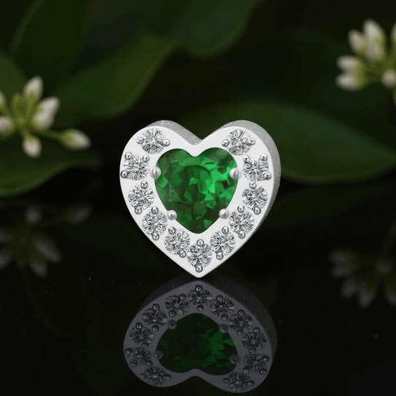 Ozdoba: zielona cyrkonia w kształcie serca otoczona 11 białymi cyrkoniami okrągłymi