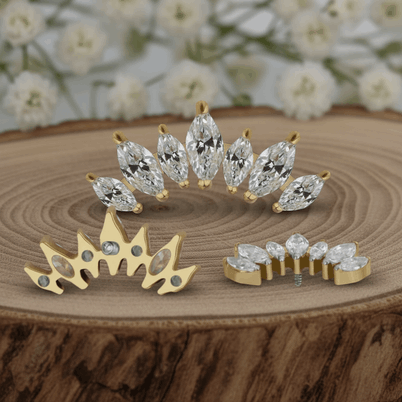 Elegancki labret, którego ozdobą jest wachlarz z siedmiu cyrkonii kubicznych w szlifie markiza. Kamienie o różnych rozmiarach zostały ułożone w subtelną gradację, tworząc harmonijną kompozycję przypominającą miniaturowy wachlarz. Białe cyrkonie pięknie odbijają światło, dając efekt delikatnego, diamentowego blasku, a złota powłoka PVD dodatkowo podkreśla ich przejrzystość i luksusowy charakter.