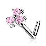 Kolczyk do nostrila z trzema różowymi kryształkami.
