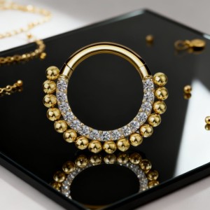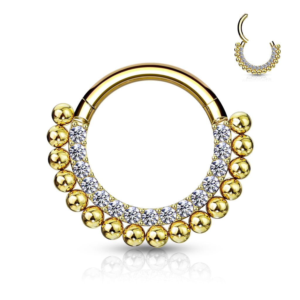 Ten złoty clicker to kwintesencja elegancji w biżuterii do piercingu. Ozdobne kuleczki w połączeniu z rządkiem lśniących białych cyrkonii tworzą efektowny design, który emanuje luksusem i klasą.