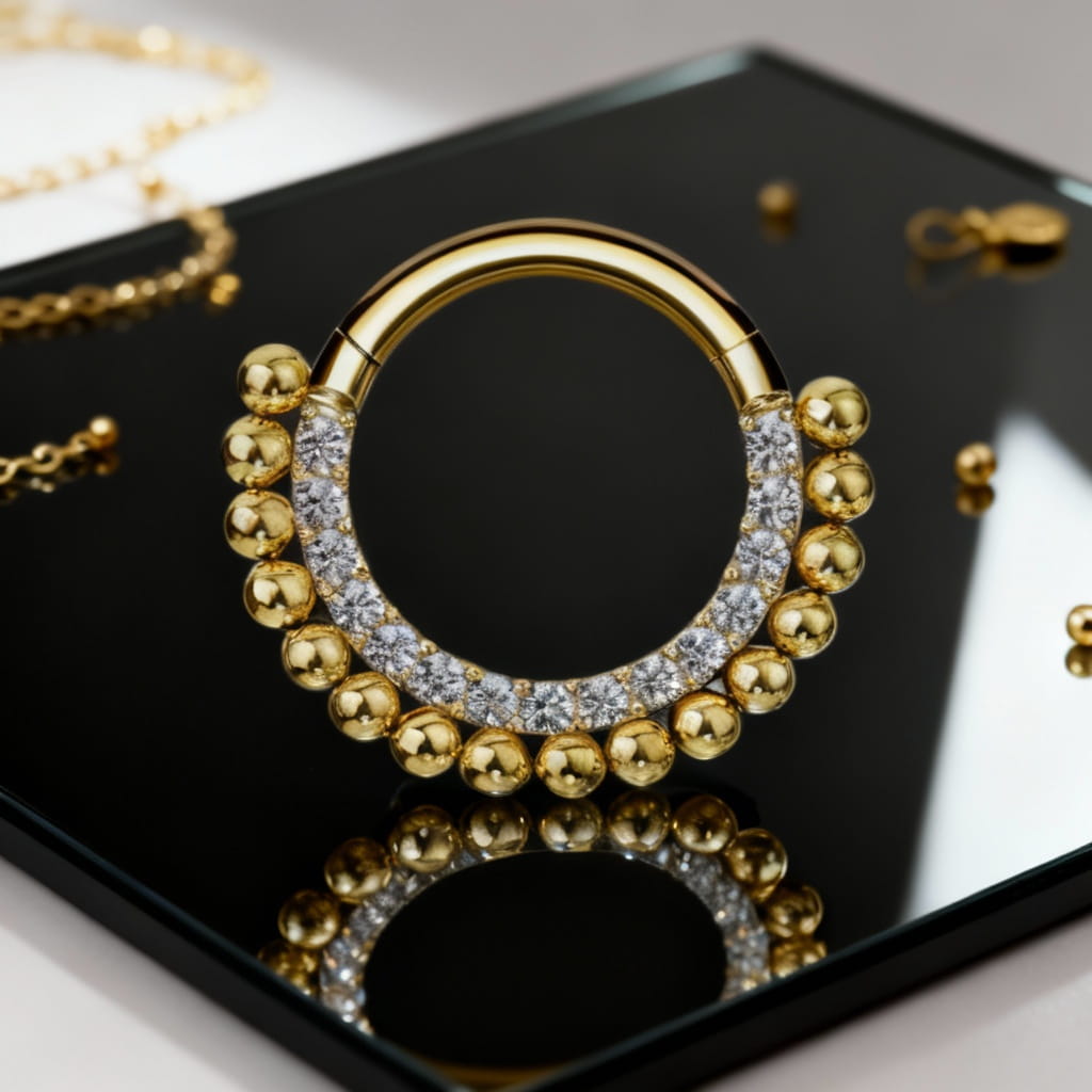 ✨ Doskonale sprawdzi się w piercingu septum oraz Daith, gdzie jego złoty połysk i błyszczące detale są doskonale wyeksponowane.